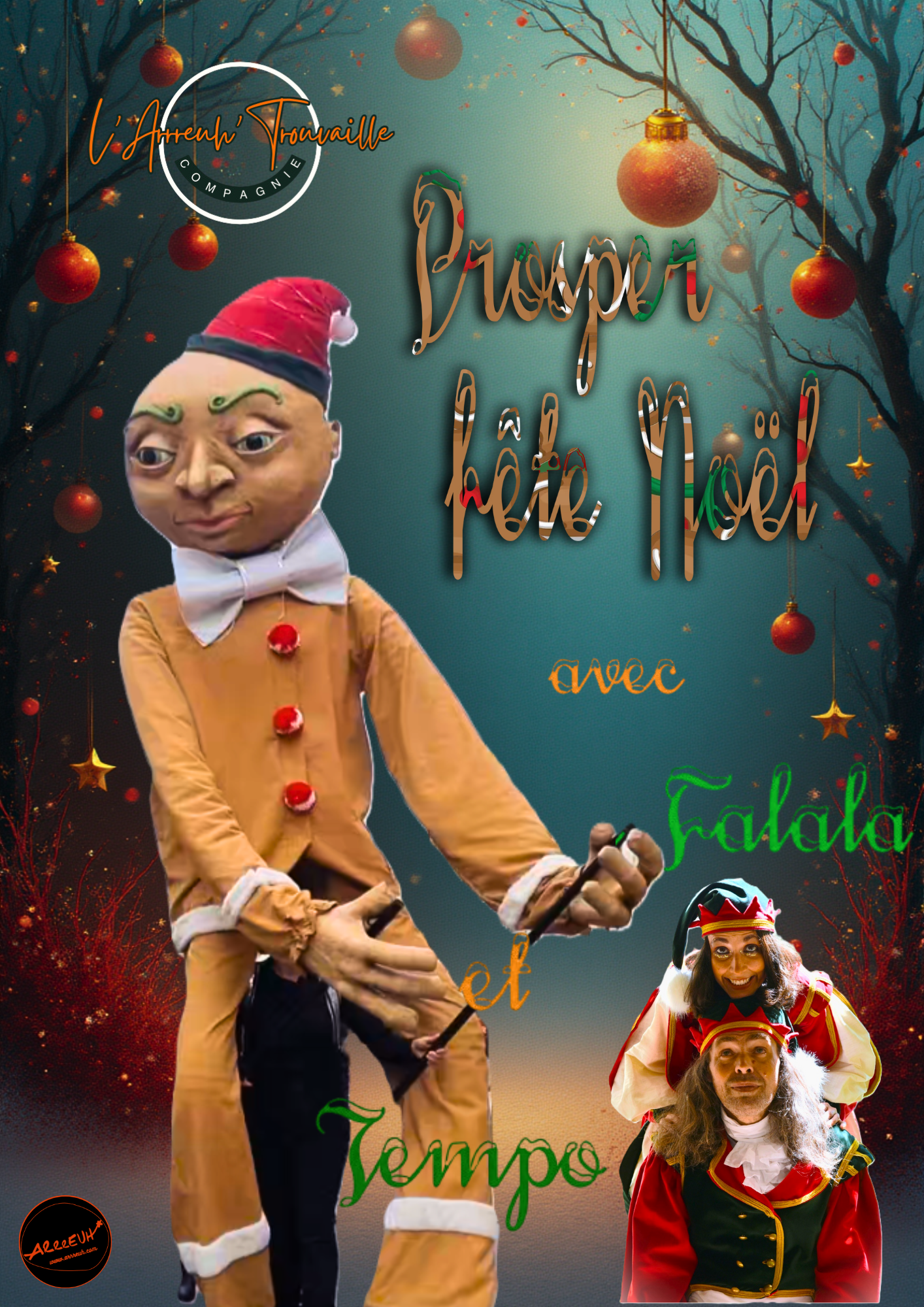 Prosper grand bonhomme de pain d’épices bien connu pour son titre de meilleur danseur du Pays du Père Noël est accompagnés par Falala et Tempo.